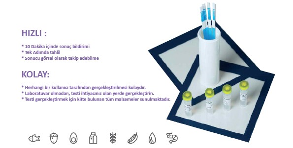 10 dakika içinde ekipman ve laboratuvar gerektirmeden; ürün ve yüzeylerde glüten, süt, yumurta, badem, fındık, ceviz, soya, balık ve kabuklu deniz ürünleri alerjenlerinin bulunup bulunmadığını doğrular.